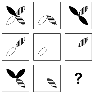 Volgens deze logica moet de ontbrekende figuur de twee zwarte ellipsen bevatten die al zichtbaar zijn in de eerste figuur van de onderste rij of rechterkolom, plus een derde zwarte ellips die ontstaat door de overlap van twee gestreepte ellipsen: