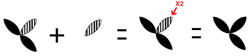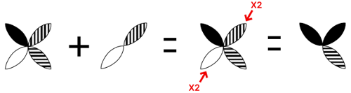 Bijvoorbeeld: de bovenste en middelste figuur in de linkerkolom delen twee elementen: de gestreepte ellips in de rechterbovenhoek en de witte ellips in de linkeronderhoek. Wanneer deze twee figuren over elkaar heen worden gelegd, verandert de gestreepte ellips in de rechterbovenhoek in een zwarte ellips en wordt de witte ellips in de linkeronderhoek verwijderd: