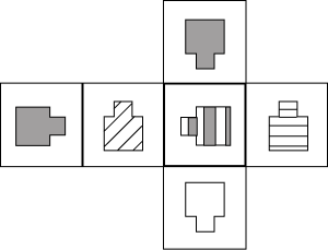 Optie 3 – Het rechtervlak zou vlak 6 moeten zijn en horizontale lijnen moeten bevatten in plaats van diagonale lijnen. De figuren op het voorvlak en het bovenvlak stellen respectievelijk vlak 1 en vlak 5 voor. Deze optie is fout.