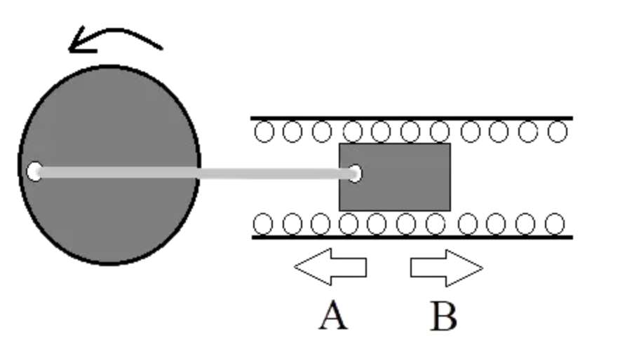 Tijdens de eerste helft van de rotatie van het wiel wordt de afstand tussen de verbindingspunten korter, waardoor de schuif naar rechts beweegt. In de tweede helft van de rotatie wordt de afstand weer groter, en beweegt de schuif naar links.
