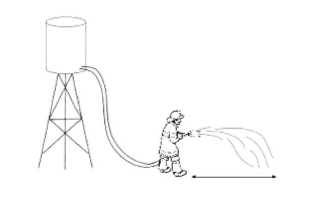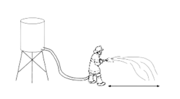 Het water in de hogere toren heeft meer potentiële zwaartekrachtsenergie. Wanneer het naar beneden stroomt, wordt die energie omgezet in bewegingsenergie, waardoor het water aan het uiteinde van de slang met een hogere snelheid uitstroomt.